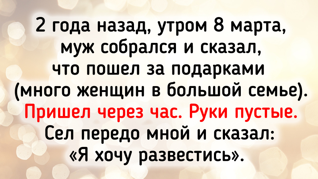 2 года назад, утром 8 марта, муж собрался и сказал, что пошел за подарками (много женщин в большой семье). Пришел через час. Руки пустые. Сел передо мной и сказал: «Я хочу развестись». © fogsfox