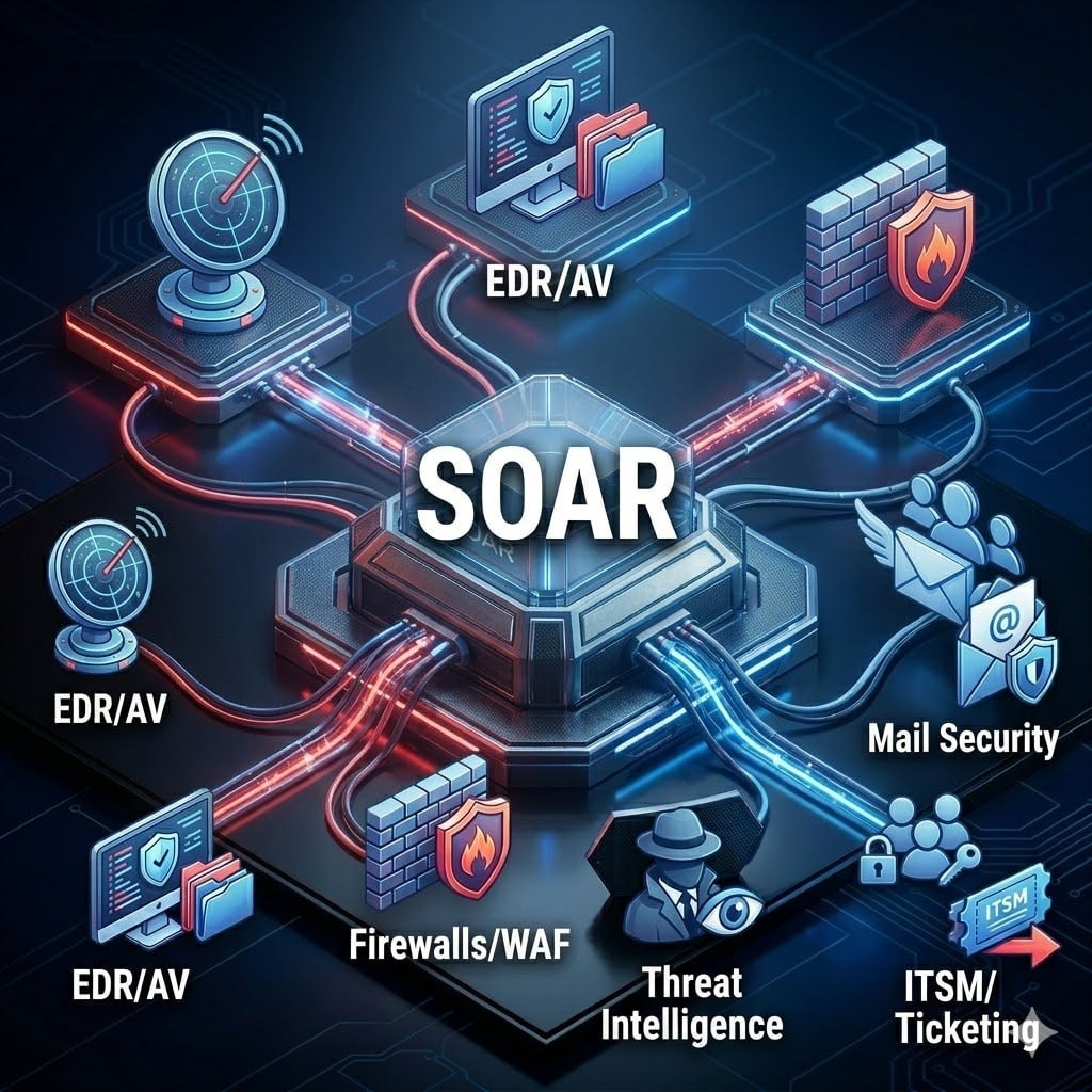 : 📡 SIEM/XDR (детектирование): Получает алерты и запускает сценарии. 🖥 EDR/EPP/AV (конечные точки): Проверяет хосты, собирает файлы, изолирует устройства. 🛡 Firewalls/WAF (сеть): Автоматически блокирует IP-адреса и домены. 🕵️♂️ Threat Intelligence (разведка): Проверяет индикаторы компрометации (IoC) по базам. 📧 Mail Security (почта): Проверяет и удаляет вредоносные письма. 👤 AD/IdP (идентификация): Проверяет права, сбрасывает сессии и пароли. 🎫 ITSМ/Ticketing (процессы): Создает тикеты и документирует инциденты. 📌 Самые частые применения SOAR в моем видео. Копия на Rutube. [00:00:45] — Как SOAR собирает контекст из разных систем (SIEM, EDR, AD). [00:02:15] — Пример плейбука по блокировке фишинговой атаки без участия человека. [00:04:10] — Интеграция с TI (Threat Intelligence) для мгновенной проверки хешей и IP. #SOAR #Экспертам @acba