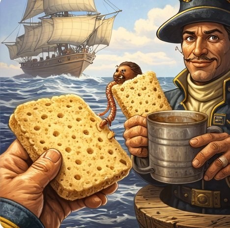 🍞почему у моряков хлеб был каменным На кораблях XVIII века обычный хлеб быстро покрывался плесенью. Поэтому морякам выдавали сухари. Это были почти каменные плитки из муки и воды. Иногда их хранили годами. Перед едой сухарь приходилось размачивать в воде, чае или роме. Внутри часто жили личинки жуков — моряки ими не брезговали, а называли их «дополнительным белком». Оптимисты, однако!