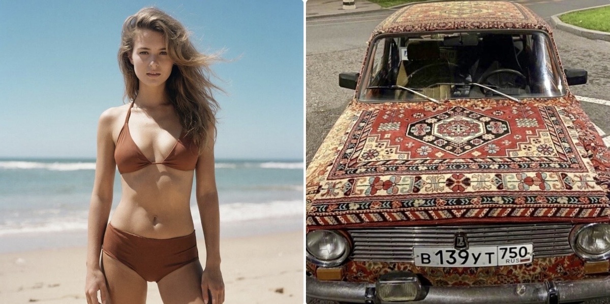 Модные тенденции также оставили в памяти яркий след. В одном из фото - девушка в купальнике эпохи 90-х, позирует на морском побережье.