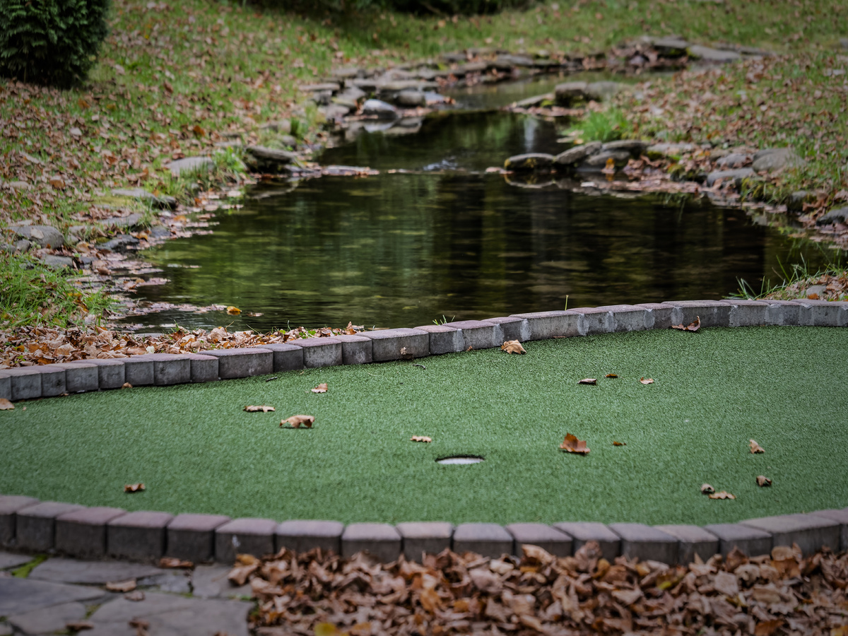 Иду дальше по территории Welna Eco Spa Resort в Тарусе. Миновал жилые домики и наткнулся на ярко-зеленое пятно в самом центре осеннего леса. Это площадка для мини-гольфа. Осень здесь выдает мощный контраст: на идеальном изумрудном покрытии лежат сухие листья дуба. Смотрится очень эффектно, прямо как кадр из фильма про красивую загородную жизнь. ⛳️ Сразу за гольфом начинается самое душевное место. Живописный ручей. Его не просто оставили в овраге, а очень бережно вписали в прогулочную зону. Через воду перебросили аккуратные мостики из дерева, а вдоль берега расставили невысокие фонарики. Тишина стоит такая, что слышно каждое касание листика о воду. 🪵 Не удержался и подошел к самому краю. Вода прозрачная, чистая. На дне видны камни, которые обросли густым и мягким зеленым мхом. Настоящий микромир со своими маленькими тайнами. 🌿 Поток бодро бежит под мостиком, огибая пучки сочной травы. Удивительно, что на календаре середина марта (судя по датам на моих исходниках), а природа здесь сохр