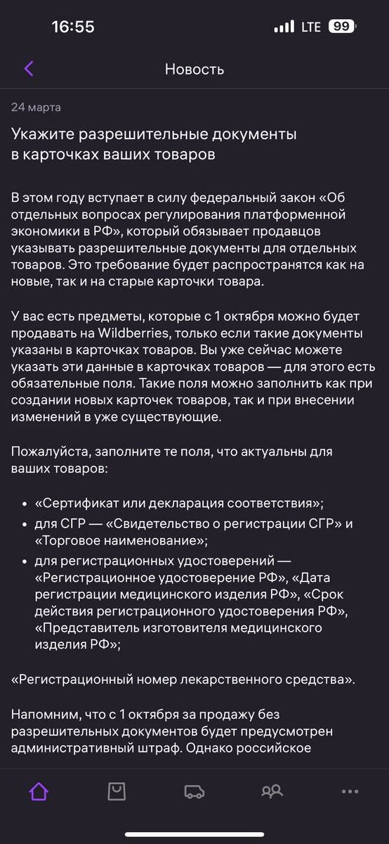 Вчера ВБ выкатил новость: с 1 октября продавцы обязаны указывать разрешительные документы прямо в карточках товаров