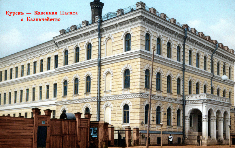 Другой шедевр – здание Государственного банка на углу Ленина и Челюскинцев, построенное в 1913 году архитектором Ф.И. Лидвалем в псевдорусском стиле с элементами романского. На фасаде – изразцовый герб Курской губернии с тремя летящими куропатками. Это здание и сегодня остаётся одним из самых нарядных в городе.