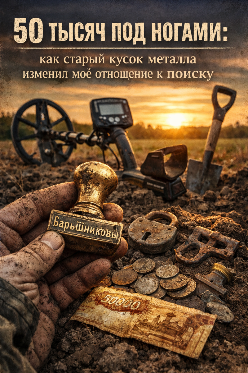 Кстати, о деньгах. Печать я в итоге продал. Но не тому антиквару, а нашел прямого покупателя — потомка рода Барышниковых (да-да, бывает и такое!), который собирает семейный архив. Ему было важно вернуть фамильную реликвию. Продал я ее дешевле рыночной цены, за 40 тысяч, но зато с ощущением, что вещь вернулась домой. А 40 тысяч — это отличный бюджет на новый «пинпоинтер» (точный щуп) и пару выездов на хорошие места в соседнюю область.