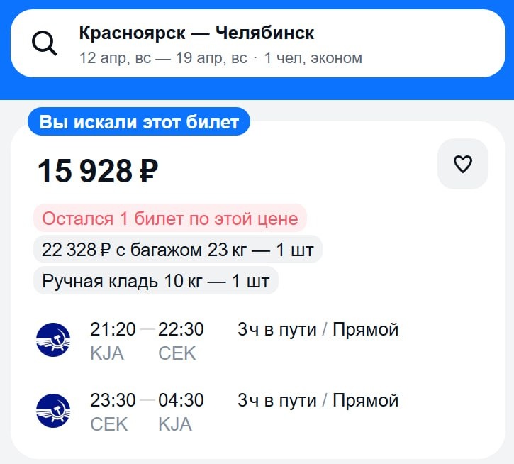 Да, такие цены теперь норм: 📍Челябинск — 15 928 ₽ (12.04-19.04) https://aviasales.tpm.lv/TzocayY8 📍Тюмень — 16 174 ₽ (01.04-06.04) https://aviasales.tpm.lv/cnmLpm3y 📍Екатеринбург — 15 512 ₽ (26.03-31.03) https://aviasales.tpm.lv/11gstrYh #CEK #TJM #SVX @KJA / KJA MAX