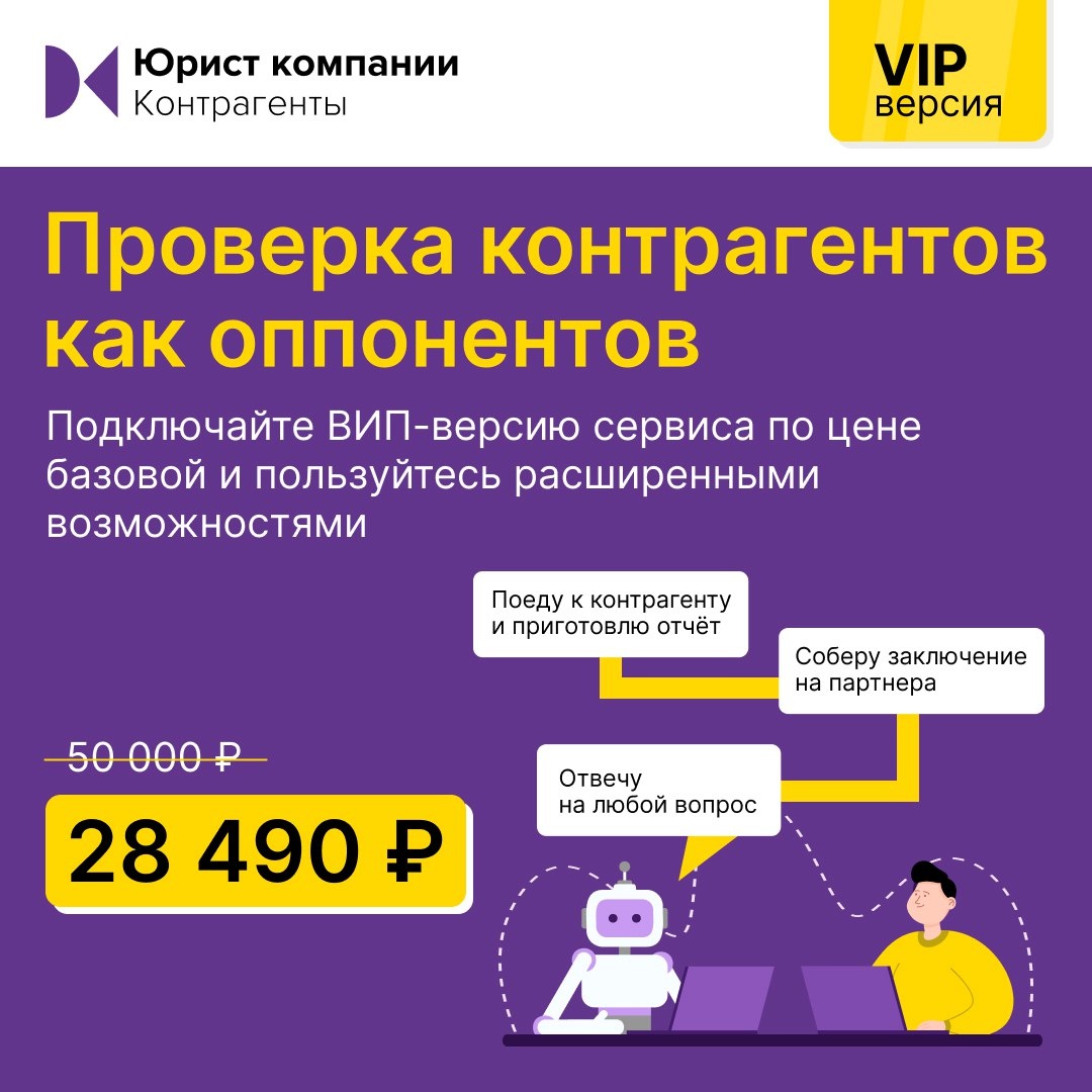 ⚡ Не просто "пробьёт" контрагента по базам, а проведёт полноценное расследование: найдёт активы для взыскания, проверит адрес с выездом, оценит финансовую нагрузку и подготовит заключение с ЭЦП, которое примут в суде, налоговой и при субсидиарке. Вип-версия Юрист компании Контрагенты — 5 дополнительных возможностей, которых нет в базовой версии, но при подключении сервиса сегодня, откроются вам без ограничений и доплат: 1️⃣ Экспертные заключения на юрлиц — официальные документы с ЭЦП под каждую сделку. Для судов, обеспечительных мер и доказывания умысла. 2️⃣ Финансовый анализ — автоматический отчет с выводами по ключевым показателям. Поможет оценить активы должника и риски неисполнения обязательств. 3️⃣ Выездная проверка адреса — личный осмотр офиса, фото с датой съемки, беседа с охраной. Железный аргумент отказаться от «пустышки». 4️⃣ Отчеты на физлиц — банкротство, суды, розыск, дисквалификация, недействительные паспорта. 5️⃣ Личный онлайн-помощник — отвечает на вопросы по конт