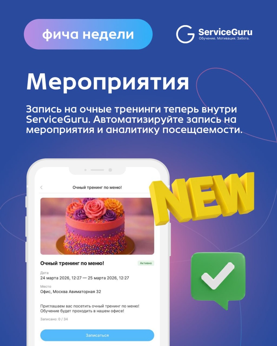 🗓 Организация обучения — это вечный хаос в мессенджерах — кто-то не увидел сообщение, кто-то забыл, а менеджер потом вручную отмечает явку в блокноте или табличке Excel. 🆕 Встречайте новый функционал в ServiceGuru — «Мероприятия»! Теперь весь цикл обучения проходит внутри платформы: ➡️Вы создаете событие за пару минут ➡️Система сама оповещает нужных сотрудников и собирает заявки ➡️В конце формируется отчет по посещаемости Листайте карточки, чтобы узнать, как это работает ⬆️ Внедряйте форматы смешанного обучения вместе с ServiceGuru — попробуйте бесплатно на 14 дней! 📲 ServiceGuru в MAX
