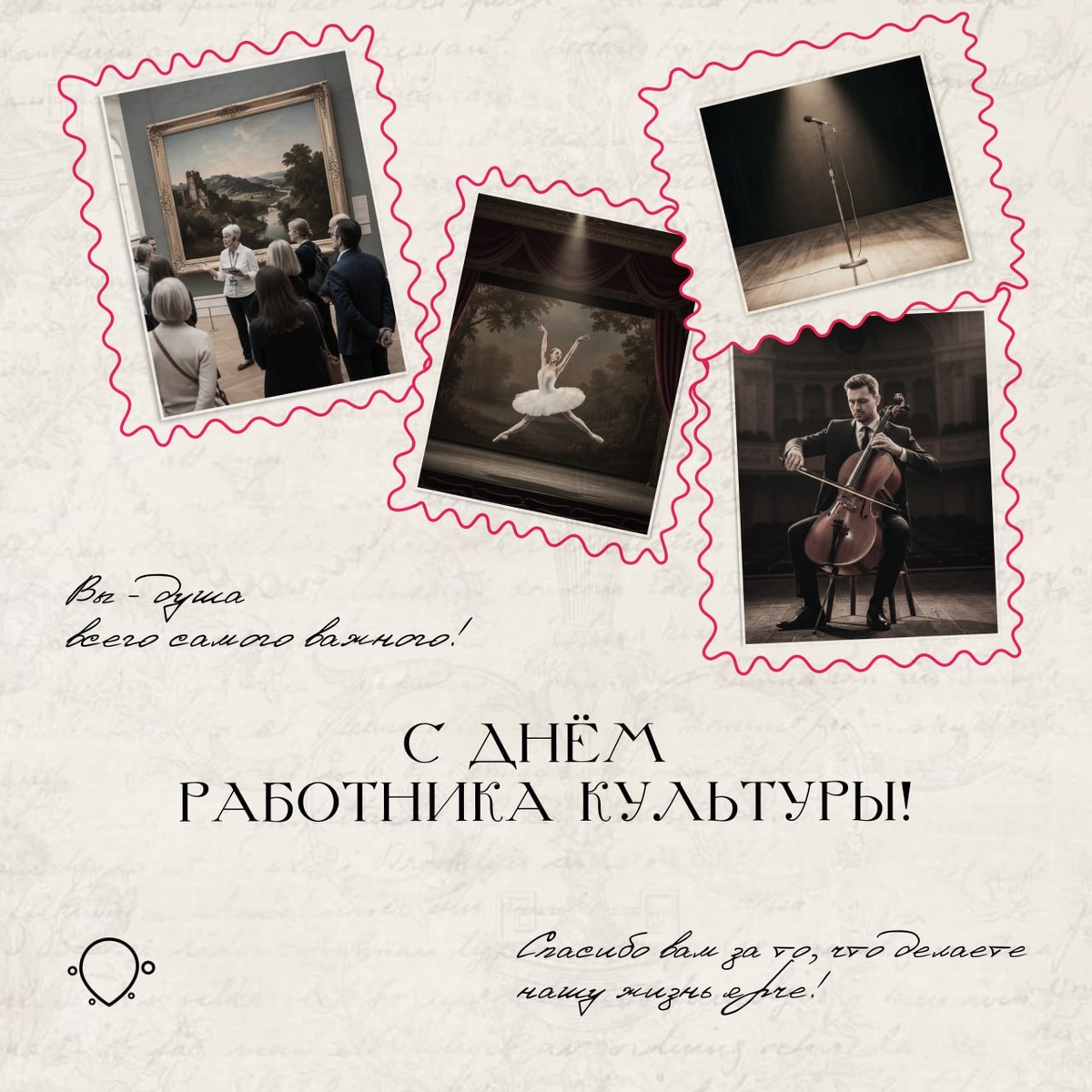 Культура — это зеркало. Мы смотрим в него и видим не только себя, но и тех, кто был до нас. Их мечты, их любовь — всё это застыло в спектаклях, картинах, мелодиях🪄 🫂А ещё культура — это люди. Те, кто выходит на сцену. Те, кто сидит в зале. Те, кто включает свет, проверяет микрофоны, встречает гостей в гардеробе. Те, кто приходит в пустой музей задолго до открытия и уходит далеко после закрытия. 25 марта празднуется День работника культуры. Спасибо вам за то, что делаете нашу жизнь ярче. За спектакли, от которых мурашки. За выставки, где хочется замереть. За концерты, что остаются в сердце. За вашу любовь к делу, за горящие глаза❤️ 🎉Вы — душа всего самого важного. С праздником! Telegram▫️VK▫️RuTube▫️Дзен▫️vc.ru #СмартГрупп_Поздравляет