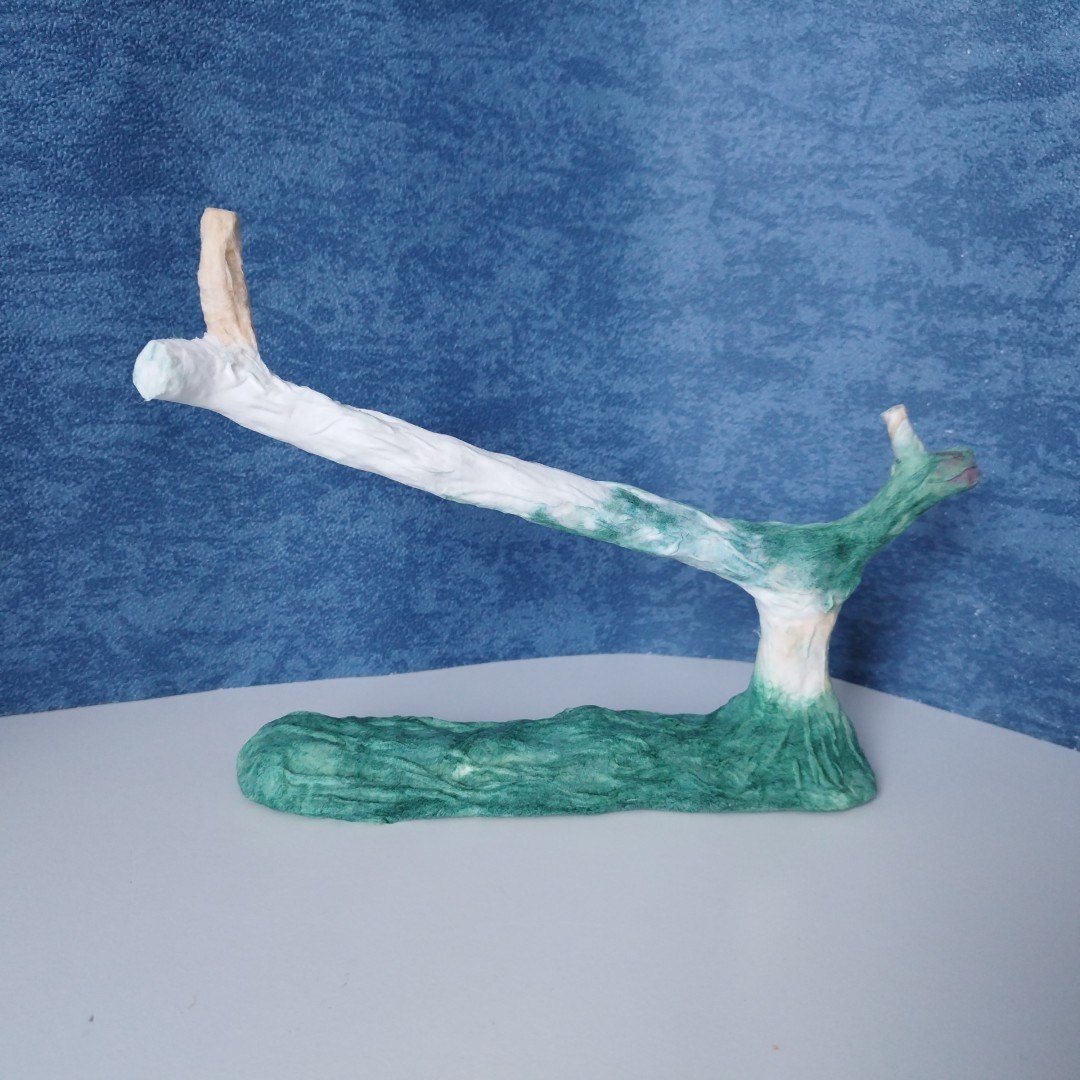 С проволоки и фольги сделала корягу и оклеила ее кусочками разного цвета ваты, все отходы пошли на корягу. Вроде кусочки маленькие, но все пошли в дело. Сделала обрезанные ветки и спил внизу.