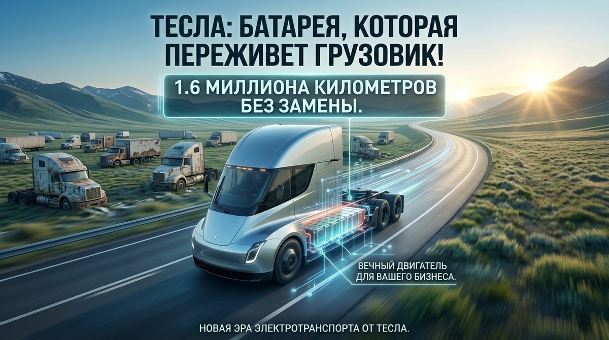 Вы когда-нибудь задумывались, что раньше сдохнет — грузовик или его батарея? Tesla решила этот вопрос раз и навсегда. Инженеры компании разработали новое поколение аккумуляторов для электрогрузовика Tesla Semi, ресурс которых составляет 1,6 миллиона километров пробега. Для понимания масштаба: среднестатистический дальнобойщик за всю карьеру наматывает около 3–4 миллионов км. То есть одной батареи хватит почти на полжизни за рулём. Это уже не просто «улучшенная» версия — это другой класс надёжности. Раньше замена аккумулятора была одной из главных статей расходов в обслуживании электрогрузовика. Теперь этой проблемы фактически не существует. Стоимость владения Tesla Semi резко падает. Именно этот аргумент заставит логистические компании массово переходить на электротягу — не экология, а деньги. Tesla тихо меняет правила игры. Снова. А вы бы доверили перевозку грузов электрогрузовику? Пишите в комментариях