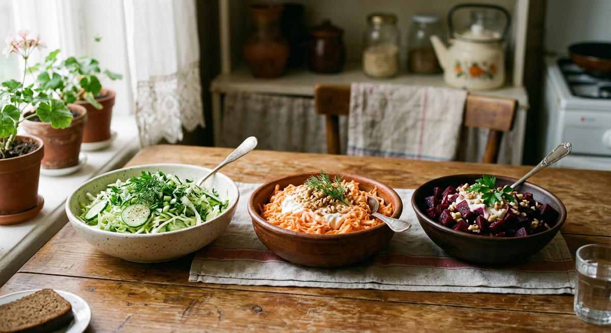 Весной почему-то особенно хочется чего-то попроще. Не майонезных тазиков на полдня, а нормальной еды из того, что и так обычно есть дома. Чтобы быстро. И чтобы без странных продуктов, которые потом лежат в холодильнике и не знаешь, куда их деть. У меня в такие дни чаще всего идут самые обычные салаты. Без претензий. Но как раз такие обычно и съедаются до конца. Вот три варианта, которые реально выручают. 1. Капуста, огурец и зелень