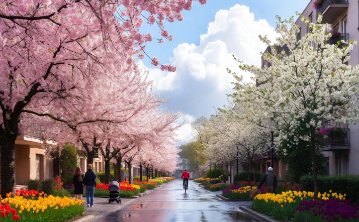 Весна в большом городе — это настоящее чудо преображения. После долгой серой зимы, когда улицы покрыты снегом и грязью, а небо кажется тяжёлым и низким, вдруг всё меняется. Солнце начинает светить ярче и теплее, дни становятся длиннее, а воздух наполняется свежим, чуть влажным запахом. С крыш звонко капает капель, снег быстро тает, образуя блестящие лужи, по которым так весело бегать детям. Город словно просыпается от зимнего сна и начинает дышать по-новому. Особенно красиво выглядит городская природа весной. В парках и скверах деревья покрываются нежно-зелёными почками, а вскоре распускаются первые листочки. На клумбах ярко зацветают тюльпаны, нарциссы и крокусы. Аллеи каштанов и сирени превращаются в душистые цветущие коридоры. Даже старые тополя и берёзы у дорог оживают и радуют глаз свежей зеленью. Птицы возвращаются из тёплых краёв и наполняют дворы и улицы весёлым щебетанием. Воробьи купаются в лужах, голуби важно ходят по тротуарам, а где-то высоко в небе можно услышать радостны