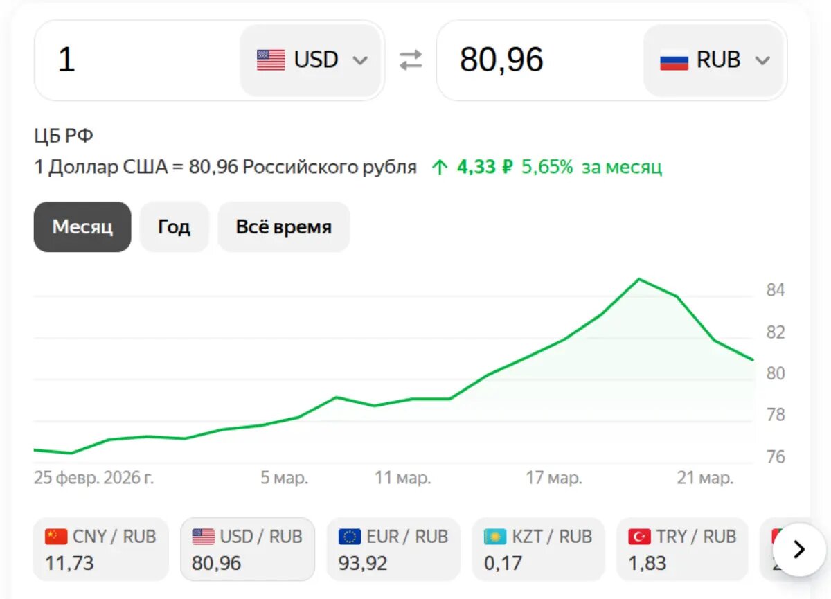 На 25 марта 2026 года российский рубль продемонстрировал заметное укрепление по отношению к доллару США. Если днем ранее курс составлял 81,88 рубля за доллар, то сегодня он снизился до 80,96 рубля. Укрепление национальной валюты происходит после периода нестабильности, когда доллар держался в диапазоне 81–82 рублей. По мнению экспертов, текущее движение связано сразу с несколькими факторами: началом налогового периода, ростом нефтяных цен и действиями финансовых властей. ❞«Рубль объективно должен укрепляться на фоне изменения ситуации на рынке нефти», — отмечают аналитики. Дополнительную поддержку рублю оказывает рост стоимости нефти, который традиционно усиливает приток валютной выручки в страну. При этом эффект проявляется с задержкой, так как экспортная выручка поступает на рынок спустя несколько недель после сделок. Также влияние оказывают решения финансовых регуляторов. Ранее изменения в бюджетном правиле и операции Минфина временно ослабляли рубль, однако сейчас рынок постепенно