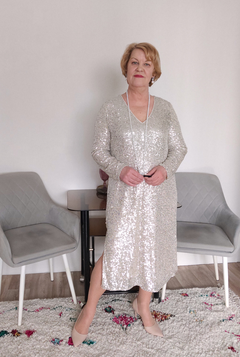 Одно, серое с люрексом, я уже несколько раз «выгуливала» в театры, а второе, молочного цвета с пайетками, пока еще не обновила. Но оно мне кажется слишком нарядным. Боюсь, что это будет слишком вызывающе, прийти в таком слишком нарядном платье в театр. Хотя я еще подумаю над этим.