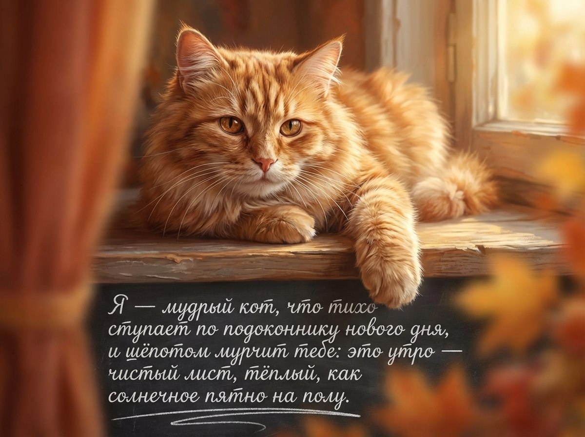 Я — мудрый кот, что тихо ступает по подоконнику нового дня, и шёпотом мурчит тебе: это утро — чистый лист, тёплый, как солнечное пятно на