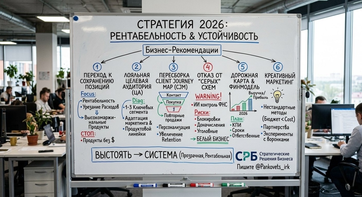 Что стоит сделать предпринимателю прямо сейчас: - Перейти от агрессивного роста к стратегии сохранения текущих позиций Пересмотрите приоритеты и урежьте расходы, которые не дают прямого измеримого результата прямо сейчас.