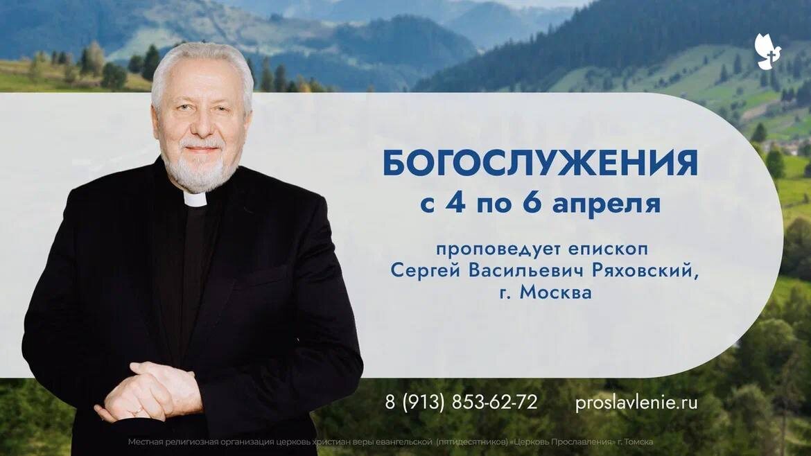 ! С 4 по 6 апреля к нам приезжает епископ Сергей Васильевич Ряховский. Расписание служений: 📆 4 апреля (суббота) 🔵16:00 — Вечер органной музыки 🔵 18:00 — Служение 📆 5 апреля (воскресенье) 🔵 11:00 — Воскресное богослужение 🔵 15:00 — Молодежное и международное служения (пер. Школьный, 6, стр. 1, 4 этаж)