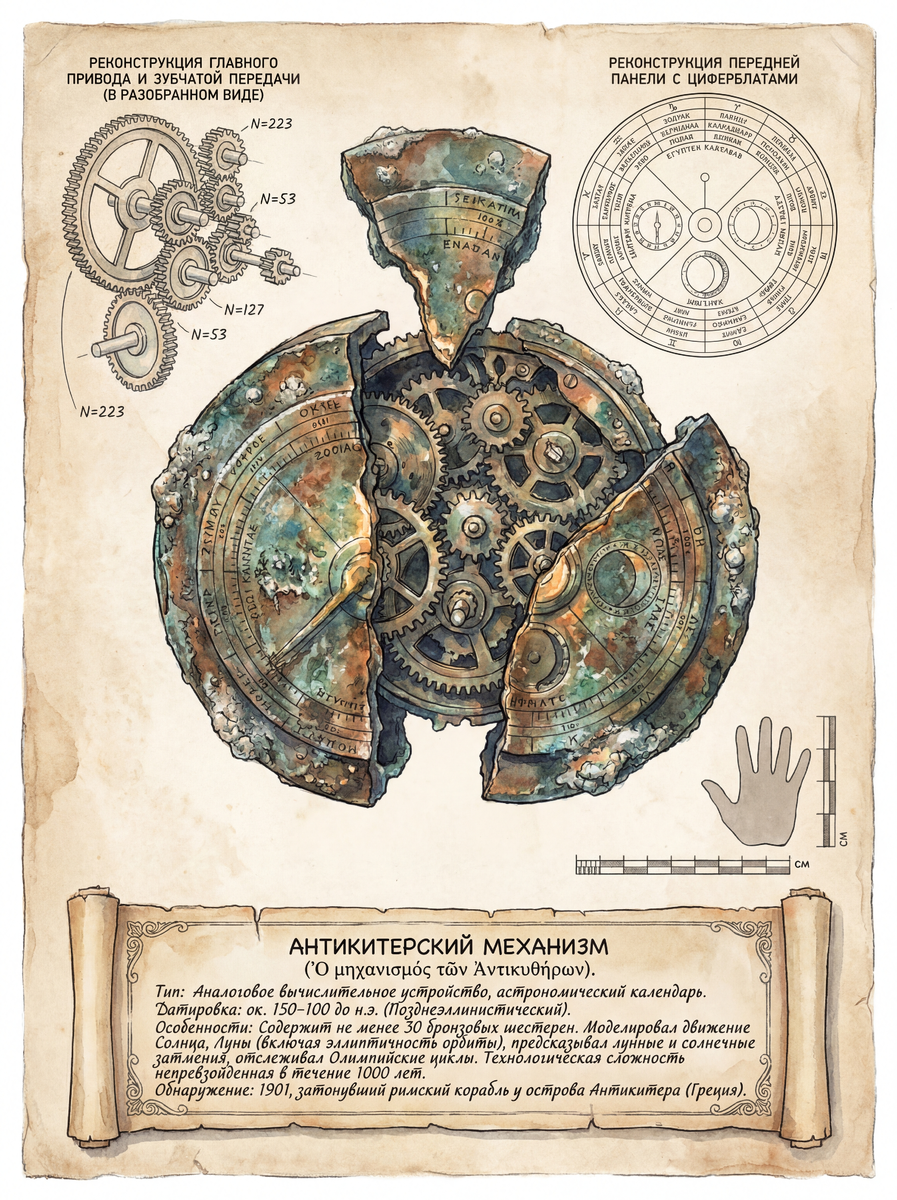 Представь, что ты нашел в море бронзовый обломок. Он пролежал на дне две тысячи лет, покрылся коркой, превратился в зелёный камень. Ты счищаешь налёт, и под ним оказывается шестерёнка. Потом вторая. Третья. Сотни шестерёнок, вложенных друг в друга, как сложнейшие часы. Ты понимаешь: это не артефакт, это технология, которой не должно было существовать в ту эпоху.
