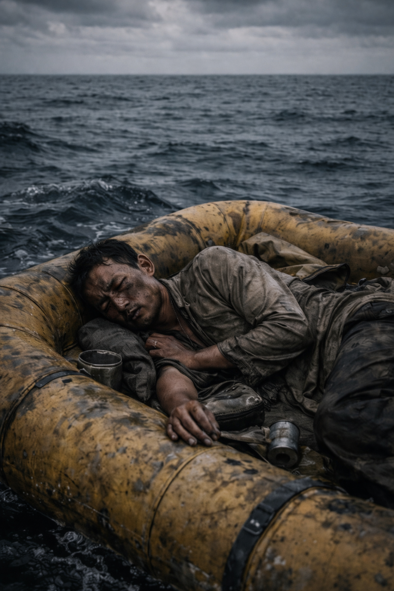 Когда силы уже на исходе, он замечает рядом тёмный прямоугольник. Это спасательный плот. Он дотягивается, цепляется за край и почти падает внутрь.