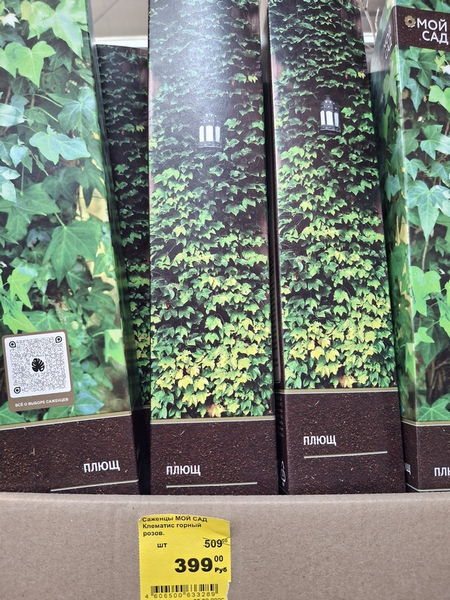 То ли мне так везет, то ли это общая тенденция в сфере продажи товаров для сада... Точно не знаю. И главное - не хочу рядить все магазины в одну одежку. Есть разные продавцы. Просто вчера я забежала в один известный крупный садовый центр буквально на двадцать минут - посмотреть, что там творится. И сразу наткнулась на несколько любопытных вещей. Вроде бы и нет какого-то явного обмана, но кругом какие-то недомолвки, неполная информация. Словом, тумана нагнали много. Судите сами. Дело происходит в Нижнем Новгороде. Перепутаны растения и ценники. Раньше так делали в супермаркетах с продуктами (может, и сейчас делают, но реже). Подойдя к полке, я увидела сначала коробки, на них явно фотографии плюща. А под коробками ценник: Видите, что на ценнике? Клематис горный розовый. Не знаю, как вам, а мне сразу в голову полезли мыслишки: о плюще, наверное, уже почти все знают, что в средней полосе это растение весьма проблемное, с ним куча нюансов. А клематис горный, да еще розовый - это кое-что