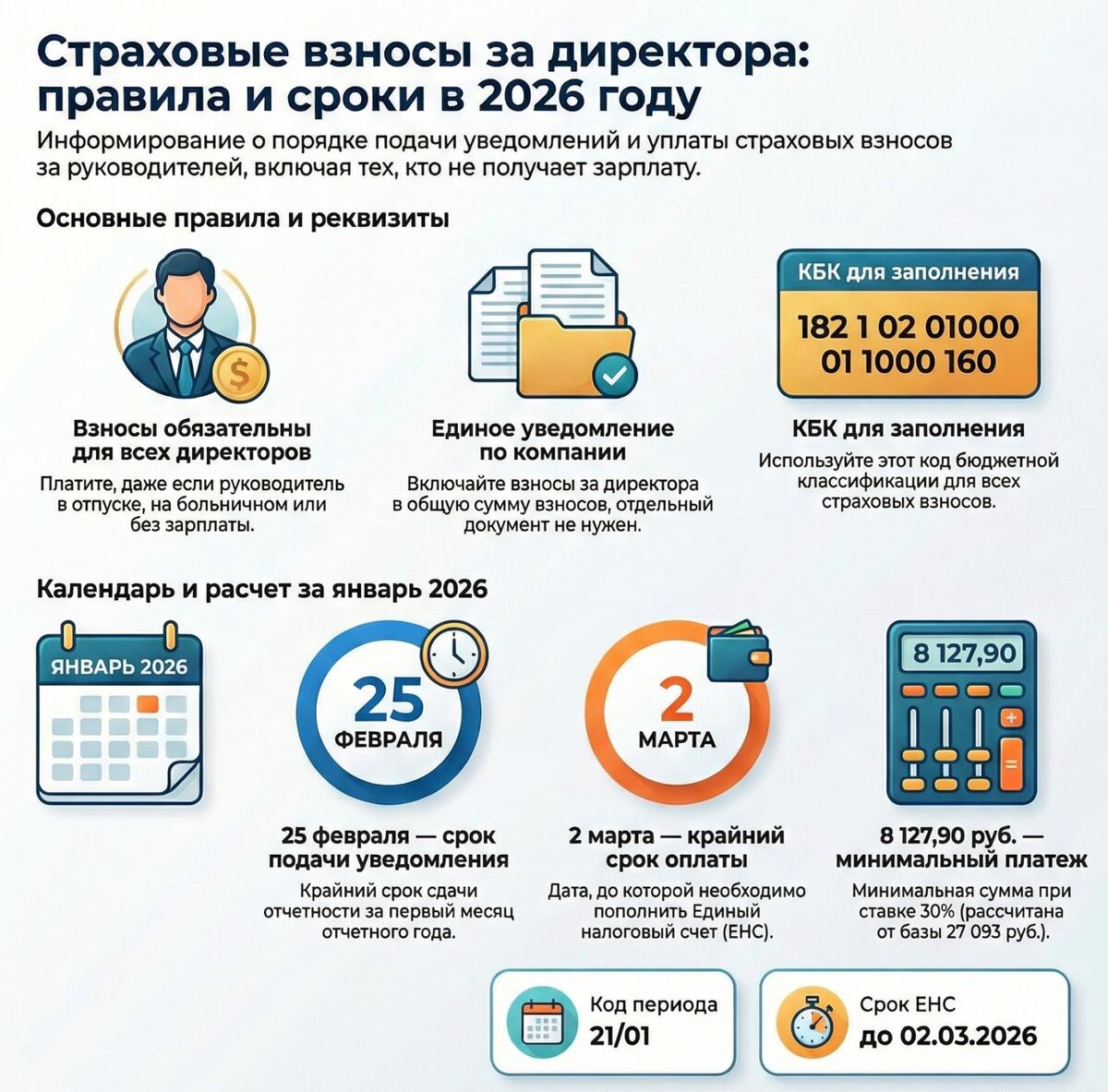 С 1 января компании платят взносы за директора всегда — даже если нет зарплаты, руководитель в отпуске или на больничном. Разбираемся, как правильно отчитаться. ⏰ Ключевые даты: • 25 февраля — срок подачи уведомления по взносам и персотчета за январь • 2 марта — крайний срок пополнения ЕНС Уведомление по взносам 📌 Важно: • Отдельное уведомление по директору НЕ подаём • Включаем взносы за директора в общую сумму по компании • КБК: 182 1 02 01000 01 1000 160 (как для всех взносов) 💰 Минимальная сумма при ставке 30%: 27 093 ₽ × 30% = 8 127,90 ₽ 📋 Краткий чек-лист: ✅ Персотчет за январь → до 25 февраля ✅ Уведомление по взносам за январь → до 25 февраля ✅ Пополнение ЕНС → до 2 марта ✅ В отчетах указываем минимум МРОТ ✅ Используем единый КБК для всех взносов — 📢 Подписывайтесь на наши соцсети! Выбирайте удобную платформу: 🎥 YouTube — Видеоуроки и разборы https://www.youtube.com/@nashabuhru