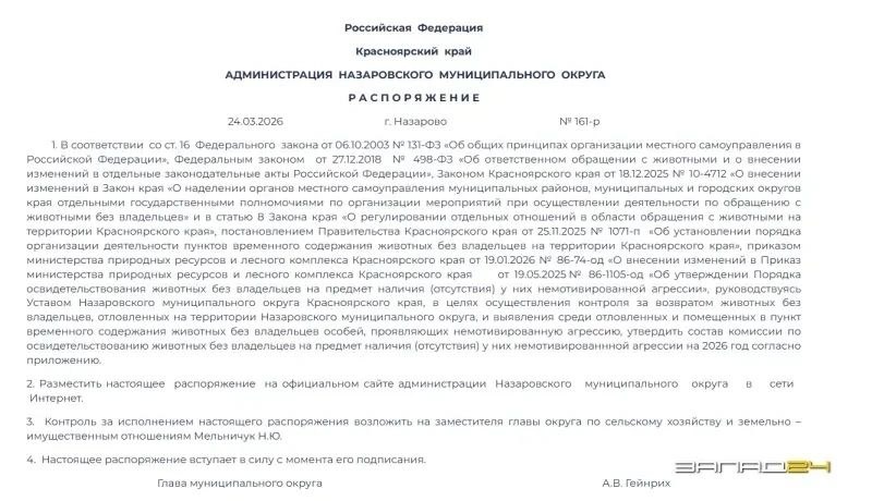 Глава Назаровского муниципального округа Александр Гейнрих подписал распоряжение о создании комиссии по освидетельствованию животных без владельцев на предмет наличия (отсутствия) у них немотивированной агрессии. «В целях осуществления контроля за возвратом животных без владельцев, отловленных на территории Назаровского муниципального округа, и выявления среди отловленных и помещенных в пункт временного содержания животных без владельцев особей, проявляющих немотивированную агрессию, утвердить состав комиссии по освидетельствованию животных без владельцев на предмет наличия (отсутствия) у них немотивированной агрессии на 2026 год согласно приложению», — говорится в документе, опубликованном на официальном сайте администрации. Состав комиссии по освидетельствованию животных на предмет наличия у них немотивированной агрессии: - Дементьева Юлия Васильевна, ИП, руководитель приюта – председатель комиссии (по согласованию); - Рожин Анатолий Николаевич, специалист-кинолог (по согласованию