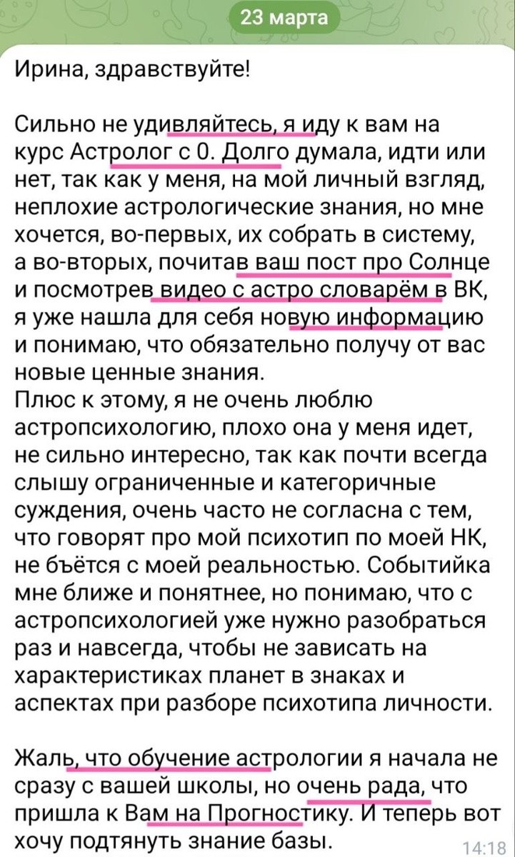 И такое бывает. Мои студенты меня удивляют и показывают высокий уровень доверия ко мне, как к преподавателю. Одна моя девочка пришла ко мне на курс по Прогнозированию на 9 поток, который сейчас выпускается. Натальной астрологии у меня не училась. Не буду пересказывать комментарий, мне лестно и одновременно ответсвенно. Потому что, порой на курс ко мне приходят девочки, с 4-мя школами астрологии за спиной. И это известные школы. И порой меня посещают мысли, ну что же я могу дать после 4 школ. И что-то такое даю, что они доходят до конца с нуля и до прогностики. Сама не знаю что, но думаю передаю свою любовь к астрологии, свое тепло и свои наработки, которые не прочитаешь в учебниках. Сама я училась с нуля в двух школах, длительно. Поэтому, если кто думает, я знаю базу, хочу сразу на прогностику, часто так бывает, что девочкам кто приходит сразу на Углублённый или Прогностику приходится закрывать много белых пятен. Если есть желание, азарт и интерес углубиться в астрологию, жду