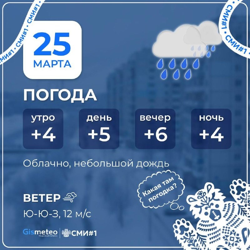Днём синоптики прогнозируют +5°. Вечером сохранится такая же температура. Ожидается сильный ветер — до 12 м/с.