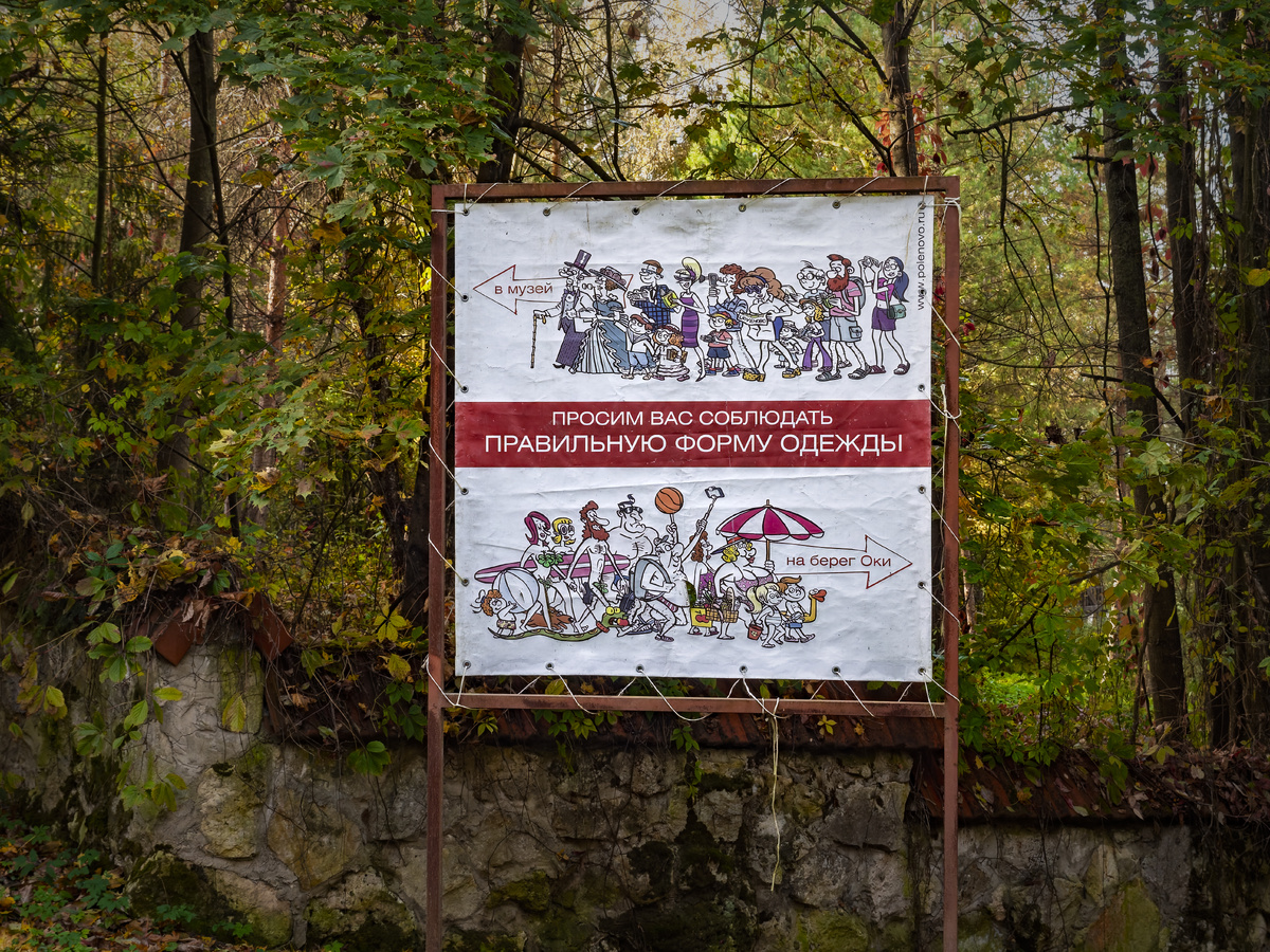 В Поленово даже к дресс-коду подходят с иронией 🎭. Прямо у лесной развилки стоит щит, который доходчиво объясняет местные правила. Хочешь зайти в музей - изволь надеть фрак или платье в пол 🎩👗. Собрался к Оке - готовь плавки и надувной круг 🩳🦢. Этот юмор сразу задает тон всей прогулке. Я решил, что мой походный прикид вполне годится для исследования парка, и свернул на одну из тропинок 👟. Осень здесь чувствуется в каждом движении воздуха 🍂. Под ногами лежит плотный слой опавших листьев, а деревья стоят так густо, что солнце пробивается сквозь ветви лишь тонкими полосками. Кажется, будто лес сам немного наклонился, чтобы лучше рассмотреть случайного гостя 🌳🌬️. Дорожка вывела меня к необычному строению. Массивная каменная кладка, темные деревянные балки крест-накрест и крутой скат крыши 🏠. Хотя это всего лишь хозяйственная постройка, выглядит она как декорация к старой сказке. К дверям ведет деревянный настил, по которому так и подмывает пробежаться ✨. Самое любопытное ждало ме