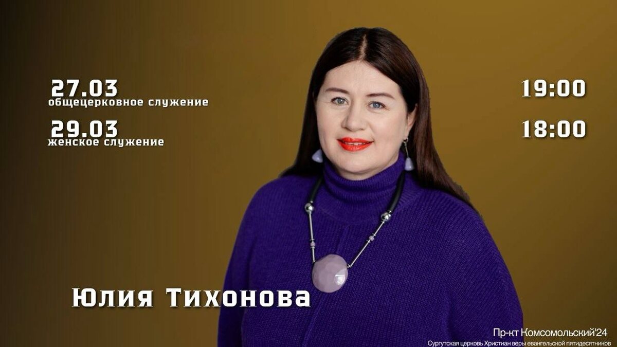 🤩🤩🤩🤩🤩🤩🤩 Дорогая церковь, уже на этой недели к нам приедет Юлия Геннадьевна Тихонова! 🤩🤩 27.03 - 19:00 общецерковное служение. 🤩🤩 29.03 - 18:00 женское служение. Юлия Геннадьевна Тихонова Пастор, исполнительный директор, советник старшего Пастора по финансово-экономическим вопросам Церкви РОСХВЕ «Церковь Прославления» г. Томска. Ведущая передач по Финансовой грамотности на Радио Благовест. Автор программы и координатор служения женщинам «Дающая Жизнь». Автор книг «Божий взгляд на финансы», «Божий взгляд на семью». Проводит семинары в разных Церквях не только в России, но и в Китае, США, Великобритании, Южной Корее. Является основателем ежегодной международной женской конференции и ютуб канала «Дающая жизнь». Непременно постарайтесь выбрать время и посетить служения с Юлией Геннадьевной. Приглашайте родных и знакомых.