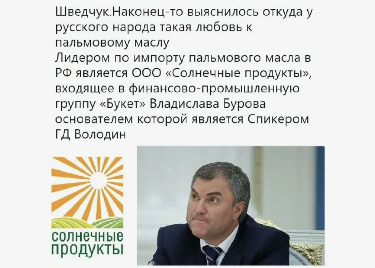 Депутаты Госдумы от фракции КПРФ Нина Останина Николай Харитонов выступили с инициативой о запрете пальмового масла в детских садах. "для обеспечения принципов здорового и безопасного питания для наиболее уязвимой категории населения" Однако, Правительство Мишустина выступило против. Против выступили и в комитете ГосДумы по охране здоровья. "Комитет Государственной думы по охране здоровья не поддерживает проект федерального закона №1107747-8 "О внесении изменения в статью 25.1 федерального закона "О качестве и безопасности пищевых продуктов" и рекомендует отклонить в первом чтении" Отметим, что "пальмовой" королевой в нашей стране по праву считается пенсионерка Барабанова, прикупившая по случаю акции компании «Солнечные продукты», чей сын Вячеслав Володин является председателем ГосДумы. При этом, сам Вячеслав Володин утверждает, что не является сторонником использования пальмового масла. «Многие говорят о вреде пальмового масла, но как ни парадоксально - отсутствуют инициативы по