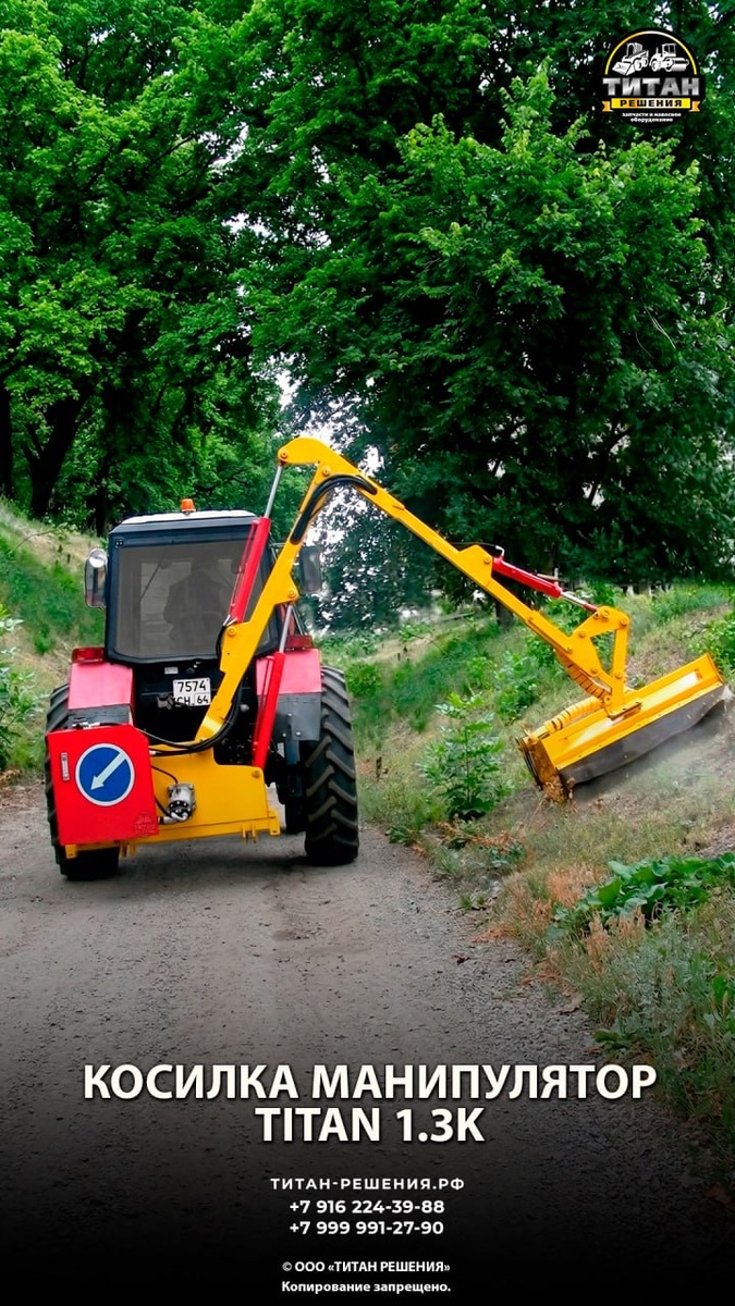 Навесной манипулятор на трактор МТЗ TITAN 1.3K с косилкой-мульчером — для расчистки труднодоступных территорий. Характеристики манипулятора: • Привод: от вала отбора мощности трактора (1000 об/мин) • Управление из кабины (джойстик) • Рабочая зона: до 6 м от трактора • Мин. мощность трактора: 70 л.с. • Мин. вес трактора: 3 т. • Гидравлическая система: независимая, с двумя насосами • Объем масляного бака: 220 л • Конструкция стрелы: двухзвенная • Гидроцилиндры: 4 шт. • Угол поворота рабочего органа: 240° • Транспортное положение: стрела складывается и поворачивается назад Характеристики косилки-мульчера: • Измельчение кустарника (до 35 мм) • Скорость скашивания: до 8 км/ч • Количество цепей/молоточков: 32 шт. • Ширина захвата: 1,2 м • Срок поставки: в наличии ✅ Лизинг - добавляет удобства и гибкости в вопросе приобретения, снимая финансовую нагрузку. 🏢 Наш адрес: г. Москва, метро Строгино, ул.Маршала Воробьева, дом 8, офис 36, 3-й этаж. 📲 +7 916 224-39-88 — Марсель 📲 +7 999 991-