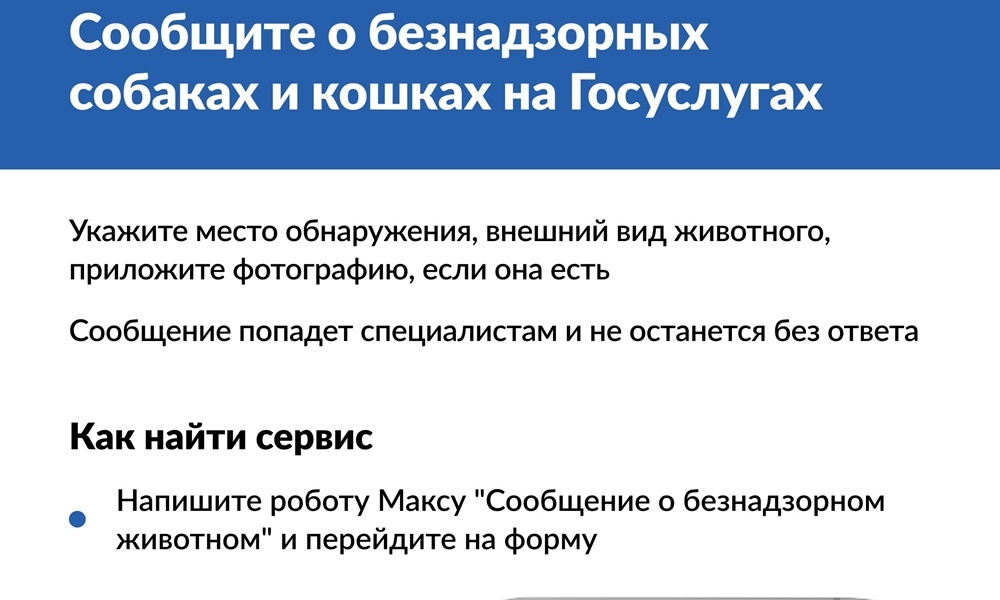 На портале Госуслуг появился новый сервис, с помощью которого жители Красноярского края могут сообщить о безнадзорных кошках и собаках. Об этом сообщили в региональном правительстве. Подать заявку можно за несколько минут. Для этого нужно указать место, где вы заметили животное, описать его вид, окрас и размер, отметить наличие или отсутствие специальной бирки, написать, проявляло ли животное агрессию, а также можно прикрепить фотографию. На основании вашего заявления специализированные службы будут отлавливать животное и доставлять его в приют. Там оно пройдёт обязательный карантин, вакцинацию и стерилизацию. Отметим, что животных с биркой в ухе, если они не проявляют немотивированную агрессию, отлавливать не будут. Бирка — знак того, что животное уже прошло все необходимые ветеринарные процедуры. Добавим, что пользователи могут отслеживать статус заявки в режиме реального времени: от момента регистрации до получения официального ответа. Перевод госуслуг в электронный вид является одн