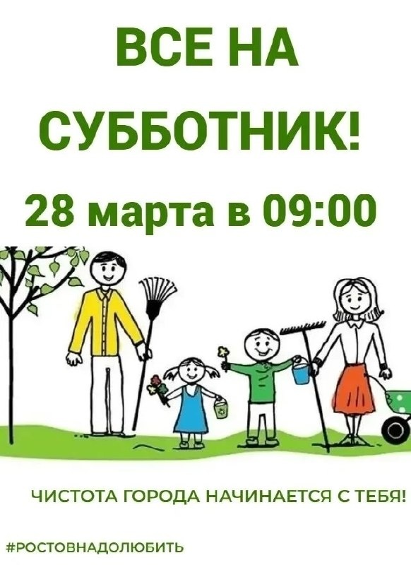 !👋 28 марта в рамках месячника чистоты пройдет очередной субботник! Старт субботника - в 9 утра. Чистый двор и ухоженные улицы - это забота не только о городе, но и друг о друге. Приглашаем вас принять участие в субботнике. Сделаем наш город чище! #РОСТОВНАДОЛЮБИТЬ