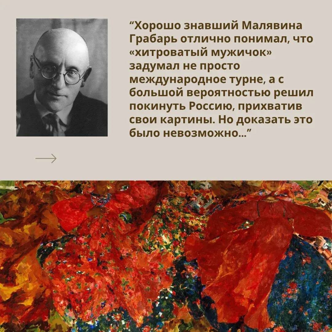 Совнаркома, собирался вывезти свои лучшие работы (включая легендарный «Вихрь») за границу навсегда. Именно Игорь Грабарь, занимавший пост директора Третьяковской галереи, смог предотвратить эту потерю. Он лично составлял протесты, использовал свой авторитет и знания (в том числе и технические — предупредив, что краски «Вихря» не выдержат перевозки), чтобы отменить решение властей. Благодаря его принципиальности и смелости шедевры Малявина остались в России. 🔗 Подробнее о непростых отношениях художника Малявина и Третьяковской галереи, а также о решающей роли Грабаря читайте в статье Елены Теркель на нашем сайте.