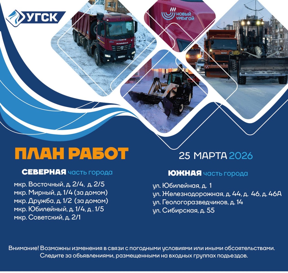 ! Сегодня запланирована уборка снега по этим адресам: СЕВЕРНАЯ ЧАСТЬ ГОРОДА: мкр. Восточный, 2/4, 2/5 мкр. Мирный, 1/4 (за домом) мкр. Дружба, 1/2 (за домом) мкр. Юбилейный, 1/4, 1/5 мкр. Советский, 2/1 ЮЖНАЯ ЧАСТЬ ГОРОДА: ул. Юбилейная, 1 ул. Железнодорожная, 44, 46, 46А ул. Геологоразведчиков, 14 ул. Сибирская, 55 Пожалуйста, освободите указанные участки от автомобилей — это необходимо для качественной и быстрой уборки снега. Будьте аккуратны на улицах — в период оттепели возможны сходы снега и наледи с крыш. Старайтесь не стоять под карнизами и козырьками зданий. 📸 УГСК 🔵Проголосовать за канал ❤️ Импульс Севера | Подписаться в MAX