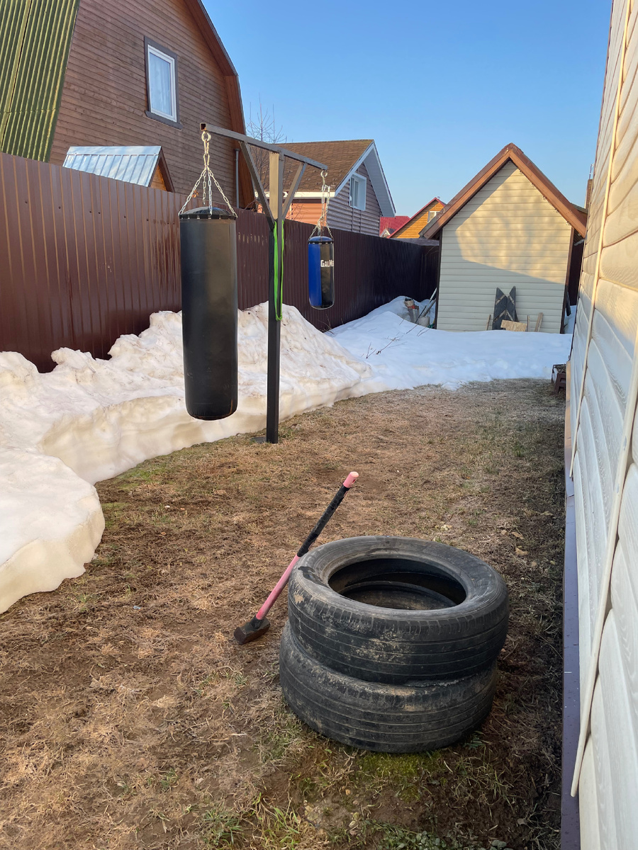 Потом вышел во двор. Солнце уже нормально грело стену дома, на турнике тёплый металл, возле груши сухая земля, ни луж, ни сырости. В такие дни обычно хочется подвигаться. Хотя бы немного. Несколько ударов, пару подходов со штангой — и тело начинает возвращать голову на место. Но не в этот раз.
