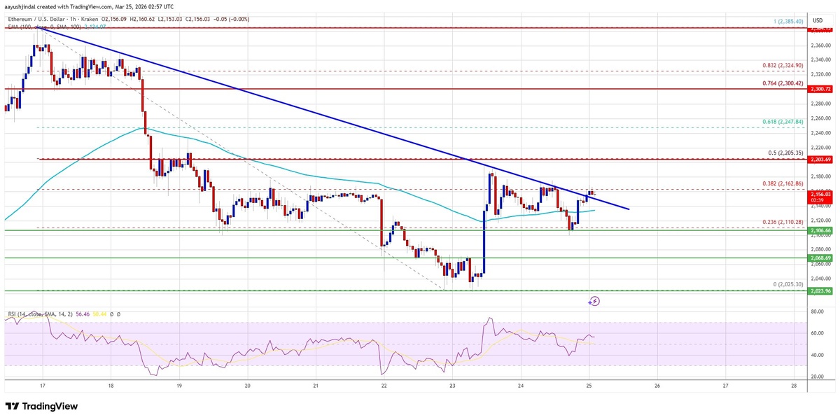 Похоже, Ethereum начал уверенное восстановление, поднявшись выше $2,065 и $2,120. Сейчас цена консолидируется выше $2,140 и 100-часовой скользящей средней, преодолев ключевую медвежью линию тренда. Если быкам удастся пробить сопротивление на уровне $2,200, возможно дальнейшее движение вверх. 📊 Ключевые моменты: - Прорыв ключевой медвежьей линии сопротивления на уровне $2,145. - Цена торгуется выше $2,140 и 100-часовой SMA. - Ближайшее сопротивление на $2,180, далее — $2,200 (50% Фибо). - В случае пробоя $2,250, возможен рост к $2,300 и выше. - MACD набирает бычий импульс, RSI выше 50. ⚠️ Риски: Если ETH не сможет пробить сопротивление $2,180, возможно снижение к $2,140, затем к $2,110 и $2,065. Горизонт: Краткосрочный