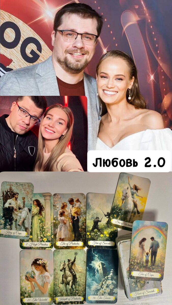 ? Что в отношениях у пары Игорь+Екатерина? Сдается мне, Гарика так и тянет к женщинам со стальным характером: Екатерина хоть и выглядит девчоночкой-тростиночкой, как и Асмус, но архетип ее в аркане Император. Ветер дует в сторону матриархата. Катюша — эпицентр событий в их семейном мирке, влюбила в себя зефирного человечка Гарика (Король кубков, Верховная жрица), обаяла, увлекла, женила (10 пентаклей) и вот уже и ребеночек на подходе (Мир). Все по плану. А план был непрост: хоть к Асмус у Харламова давно ничего нет, сплошные проблемы от нее у артиста (Башня), но дочка… дети после развода часто становятся камнем преткновения, поэтому родить—самый важный пункт. Даже брак в раскладе не так значим, как ребенок. В перспективе у пары стабильные семейные отношения (10 пентаклей, 10 кубков, Рыцарь пентаклей), в которых лидер—женщина (6 жезлов). Ребеночек станет на время центром их Вселенной. Ну а судя по арканам Башня и 5 мечей, с Катей Гарику скучать не придется. 🧩Кто хочет узнать свой Ар