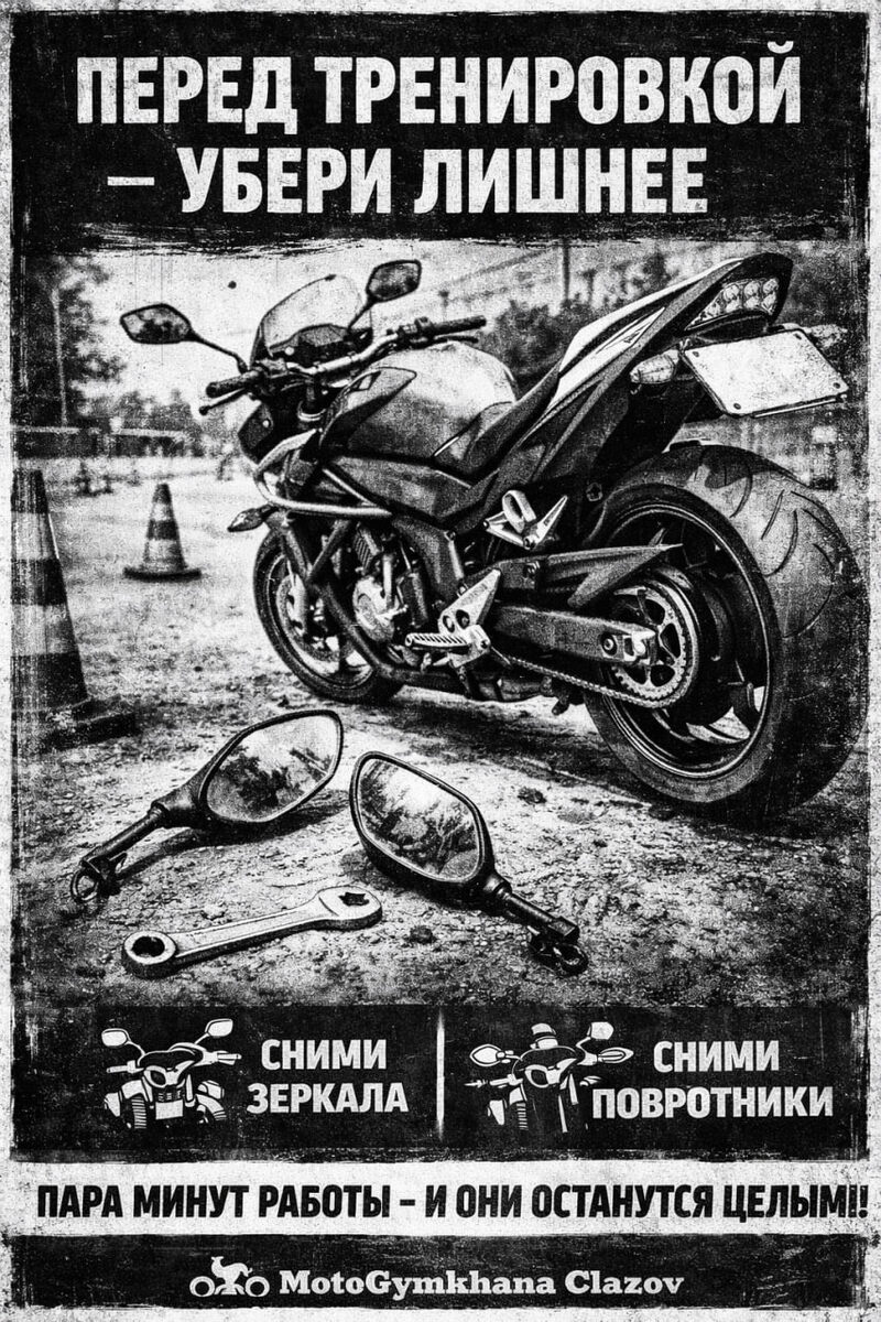 Запчасти для мотоцикла сегодня стоят недёшево. А для некоторых моделей — очень недёшево. Поэтому и появились моторазборки — иногда они действительно выручают, когда нужно найти зеркало, поворотник или другую мелочь. Но есть один момент. Именно зеркала и поворотники чаще всего страдают при падениях. А в мотоджимхане падения — это часть тренировочного процесса. На малой скорости, без серьёзных последствий, но всё же падения случаются. Поэтому опытные райдеры обычно делают одну простую вещь перед тренировкой: снимают всё, что выступает. В первую очередь: • зеркала • поворотники (если они сильно выступают) Это занимает буквально пару минут с гаечным ключом, но может сэкономить время, деньги и нервы. Лучше потратить несколько минут перед тренировкой, чем потом искать нужную деталь на моторазборке. В мотоджимхане безопасность — это не только экипировка, но и правильная подготовка мотоцикла к тренировке.