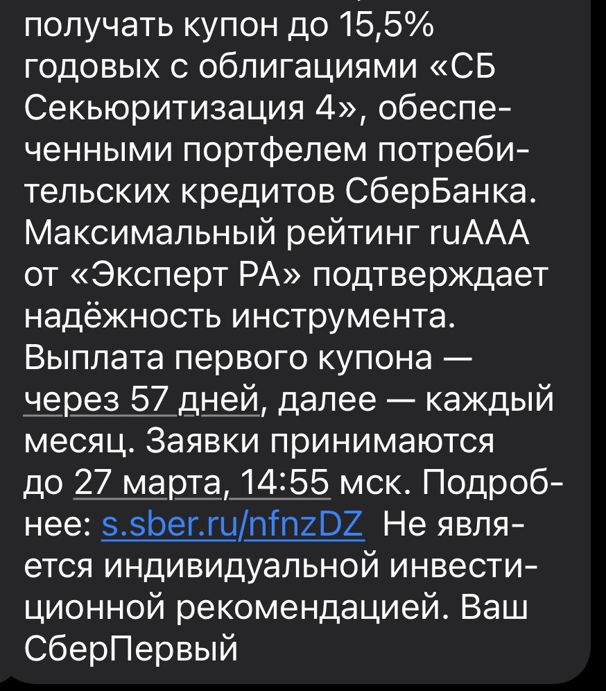 В последнее время написал несколько статей о том, что представляют собой рейтинги российских агентств: И вот свежий пример. Сегодня Сбербанк прислал смс-ку: Прям учебник по манипуляции: Для неискушенного инвестора выглядит , как заклинание. Вот только никакую надежность подтвердить этот «Эксперт РА» не может. Свежий случаи с «Евротрансом» тому подтверждение. А еще можно вспомнить рейтингование «ЮтЭйр» и «Дэнниколл» перед дефолтом: Оценка надежности секьютиризированных облигаций (облигации обеспеченных кредитами третьим лицам) очень важна. Напомню, что неправильная оценка надежности облигаций, обеспеченных ипотекой в США, стали причиной мирового финансового кризиса 2008 года. Под конец еще одно замечание: Даже если надежность данных облигаций была оценена верно, нет никакого смысла покупать долги частных лиц со ставкой «до 15.5%», если ключевая ставка 15%, а сверхнадежные ОФЗ дают 14.5%. Из-за мифического «1% в год» лезть в такую муть нет никакого резона. По этой же причине не стоит и и