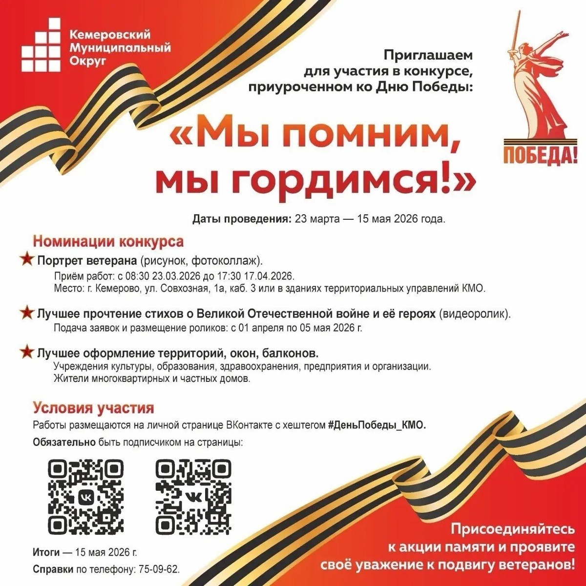 !» Для участия нужно выложить работу во «ВКонтакте» с хештегом #ДеньПобеды_КМО, подписаться на официальные страницы (QR-коды на афише). Итоги будут подведены 15 мая. Вопросы по телефону: 75-09-62.