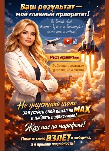 Сейчас на MAX — только живые люди, которые готовы покупать. Завтра вход может стать платным, и поезд уйдет. Боишься новой площадки? Не знаешь, как оформлять и набирать подписчиков? 😍 Я проведу за руку на онлайн-марафоне. Выходи в первые ряды, пока есть время. 👉 УЗНАТЬ ПОДРОБНОСТИ Татьяна Михиенко +7 (908)221-38-63