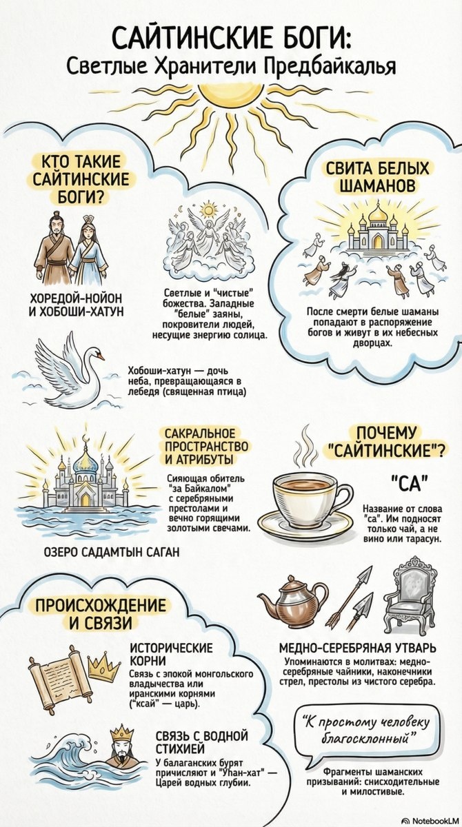 Сайтинские боги — светлые и «чистые» божества, западные «белые» заяны, покровительствующие людям и несущие энергию солнца. К ним относятся Хоредой-Нойон и Хобоши-Хатун. Последняя, согласно преданиям, является дочерью неба, способной превращаться в лебедя. После смерти в распоряжение этих богов попадают белые шаманы, которые живут в их небесных дворцах. Обителью богов считается сияющее пространство «за Байкалом» (озеро Садамтын Саган) с серебряными престолами и золотыми свечами. Название «Сайтинские» происходит от слова «са»: этим божествам подносят только чай, исключая вино или тарасун. Исторические корни культа связывают с эпохой монгольского владычества или иранскими корнями («ксай» — царь). В молитвах упоминается специфическая медно-серебряная утварь: чайники и наконечники стрел. Божества характеризуются как снисходительные и милостивые к простому человеку. Канал нашей студии https://t.me/chimitdorzhi_studio