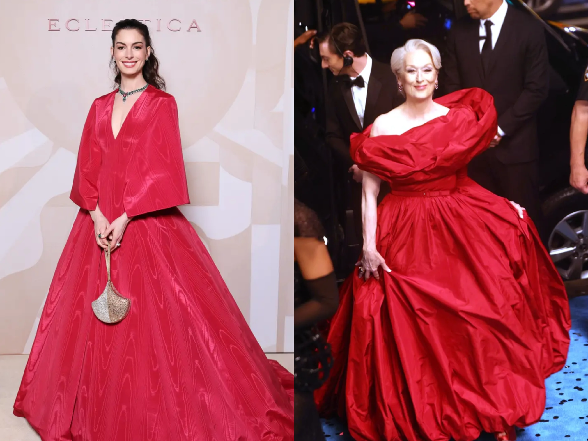 Иногда мода словно подмигивает зрителю. На ужине Bvlgari Энн Хэтэуэй появилась в образе, который невольно заставляет вспомнить одну из самых влиятельных женщин в истории модного кино, Миранду Пристли из фильма «Дьявол носит Prada». И это совпадение оказалось удивительно точным по настроению. Актриса выбрала эффектное платье Valentino от кутюр из красного шёлкового муара. Ткань с характерной рельефной фактурой создаёт глубокую игру света, благодаря которой оттенок красного выглядит особенно насыщенным и благородным. Силуэт построен на драматичном объёме. Глубокое декольте открывает линию шеи, а мягкая накидка, спадающая по плечам и спине, добавляет образу почти королевскую плавность движения. Главный акцент, конечно, оказался на украшениях. На шее актрисы сияло впечатляющее колье Bvlgari Secret Garden. Это сложная ювелирная композиция из бриллиантов, изумрудов, оникса, розовых и фиолетовых сапфиров. Работа над украшением заняла около 1200 часов ручной сборки, что делает его настоящим пр