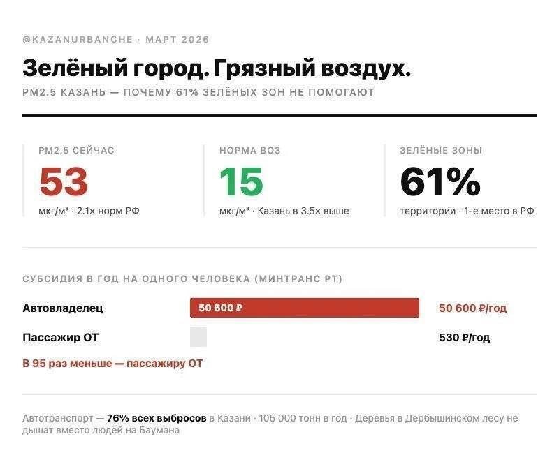 ? В Казани зафиксировали сильное загрязнение воздуха. Уровень загрязнения почти в 4 раза превышает норму! И это при условии, что Казань занимает 1 место в РФ среди городов с уровнем зеленых зон. 📲 Читайте нас в MAX 😊 Подписаться | Прислать новость