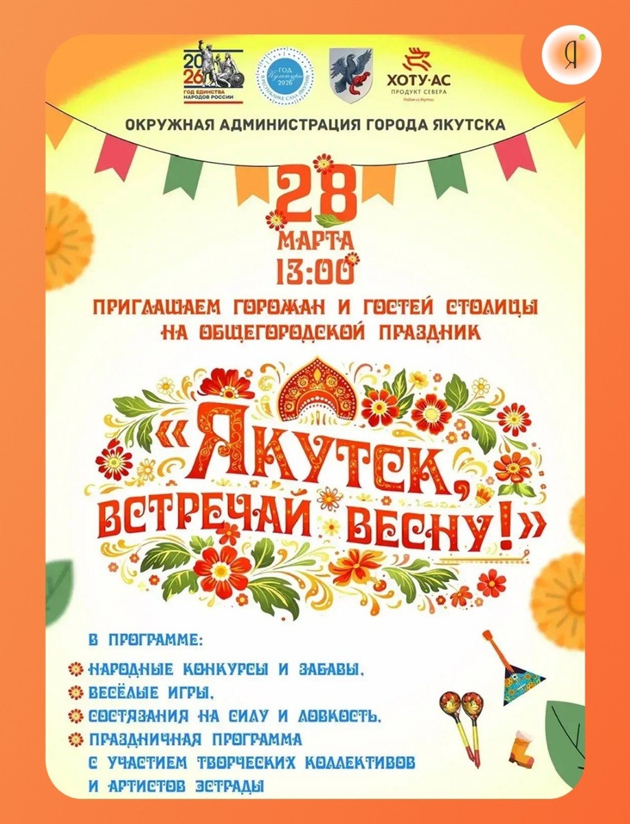 !» 28 марта в 13:00 в Парке культуры и отдыха. В программе: 🔸народные конкурсы и забавы; 🔸веселые игры для детей и взрослых; 🔸состязания на силу и ловкость; 🔸праздничная программа с участием творческих коллективов и артистов эстрады. Весна время радости, тепла и новых надежд. Давайте встретим ее вместе в кругу друзей, с песнями, улыбками и отличным настроением. Online Якутия | Ждем вам в МАХ