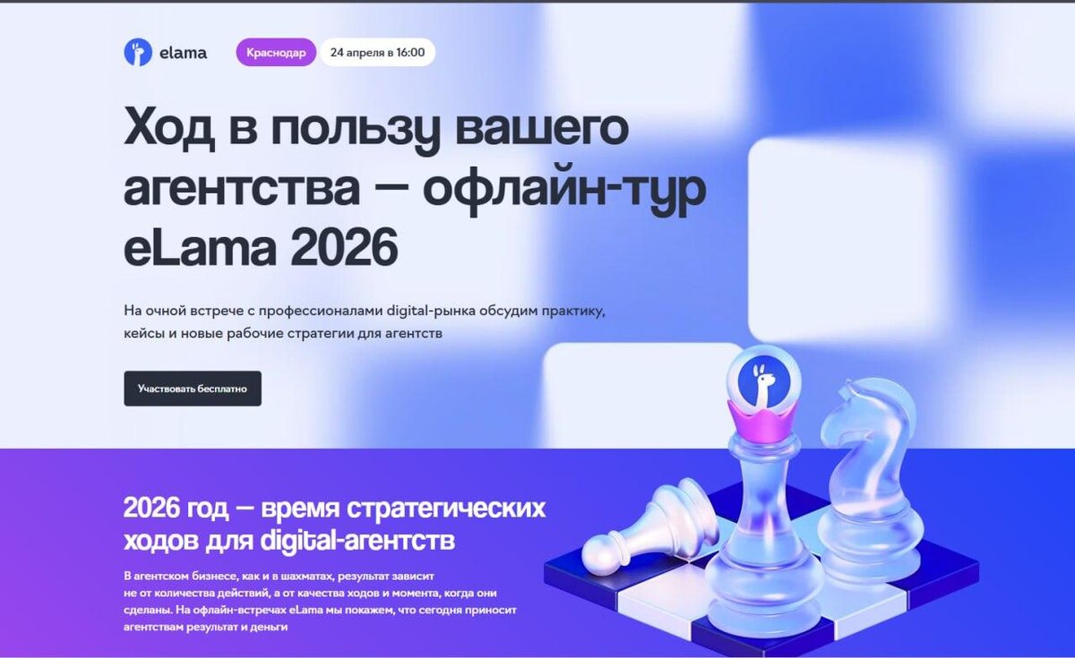! 🎤 eLama (сервис для маркетологов и бизнеса, входит в группу компаний Яндекс) в 2026 году проводит большой тур по городам. Мое выступление пройдет в Краснодаре с темой: «Как работать с клиентами годами и иметь высокий LTV в 2026 году». Я в маркетинге уже более 7 лет, а средний срок жизни проекта в нашем агентстве — 3 года. Мне точно есть чем поделиться и что рассказать про долгосрочное партнерство. Приятно, что такие крупные площадки приглашают меня в качестве эксперта. Думаю, будет горячо! 🔥 🗓 Когда: 24 апреля, 16:00 📍 Где: Краснодар 👉 Регистрация