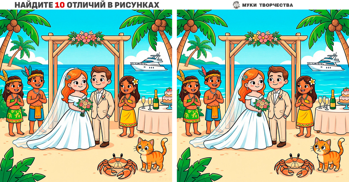 Сегодня сложная задачка для особо внимательных и зорких. Найдите 10 отличий на похожих картинках со свадебной церемонией молодой пары на тропических островах. Чтобы молодожёны жили счастливо и долго, помогите им найти все отличия. Постарайтесь, ведь на кону их счастье. Ну а если не получится найти все отличия, то не отчаивайтесь, стерпится-слюбится, как-нибудь проживут. По статистике каждый второй брак разваливается. Сверьте свои результаты с подсказкой в конце статьи. И напишите в комментариях, как вам было, сложно? Детали мелковаты или норм? Горизонтальный тест на внимательность: Тропическая свадьба Вертикальный тест на внимательность: Тропическая свадьба Ух ты! Тут есть ещё подобные тесты: Ответ (ПОДСКАЗКА):