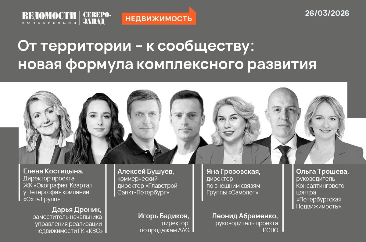 ». Деловое издание «Ведомости Северо-Запад» 26 марта проведет конференцию «От территории – к сообществу: новая формула комплексного развития». Мероприятие посвящено формированию долгосрочной ценности территории, повышению качества жизни людей и созданию проектов комплексного освоения территории (КОТ). ↩️ В фокусе обсуждения: 📍Как девелоперы строят не просто дома, а формируют запрос на новый образ жизни? 📍Технологии и подходы, позволяющие создавать качественные и доступные квартиры. Как найти баланс между стандартизацией и персонализацией? 📍Остается ли классическая квартира в новостройке инвестиционным активом? Как комплексность проекта (экология, социальная инфраструктура) влияет на долгосрочный рост стоимости? 📍Модели эффективного взаимодействия при комплексном освоении. Инвестиции в социальную инфраструктуру: риски, гарантии, механизмы. 📍Баланс интересов бизнеса и власти при реализации проектов КРТ. 🗞 Telegram | 🗞 Max